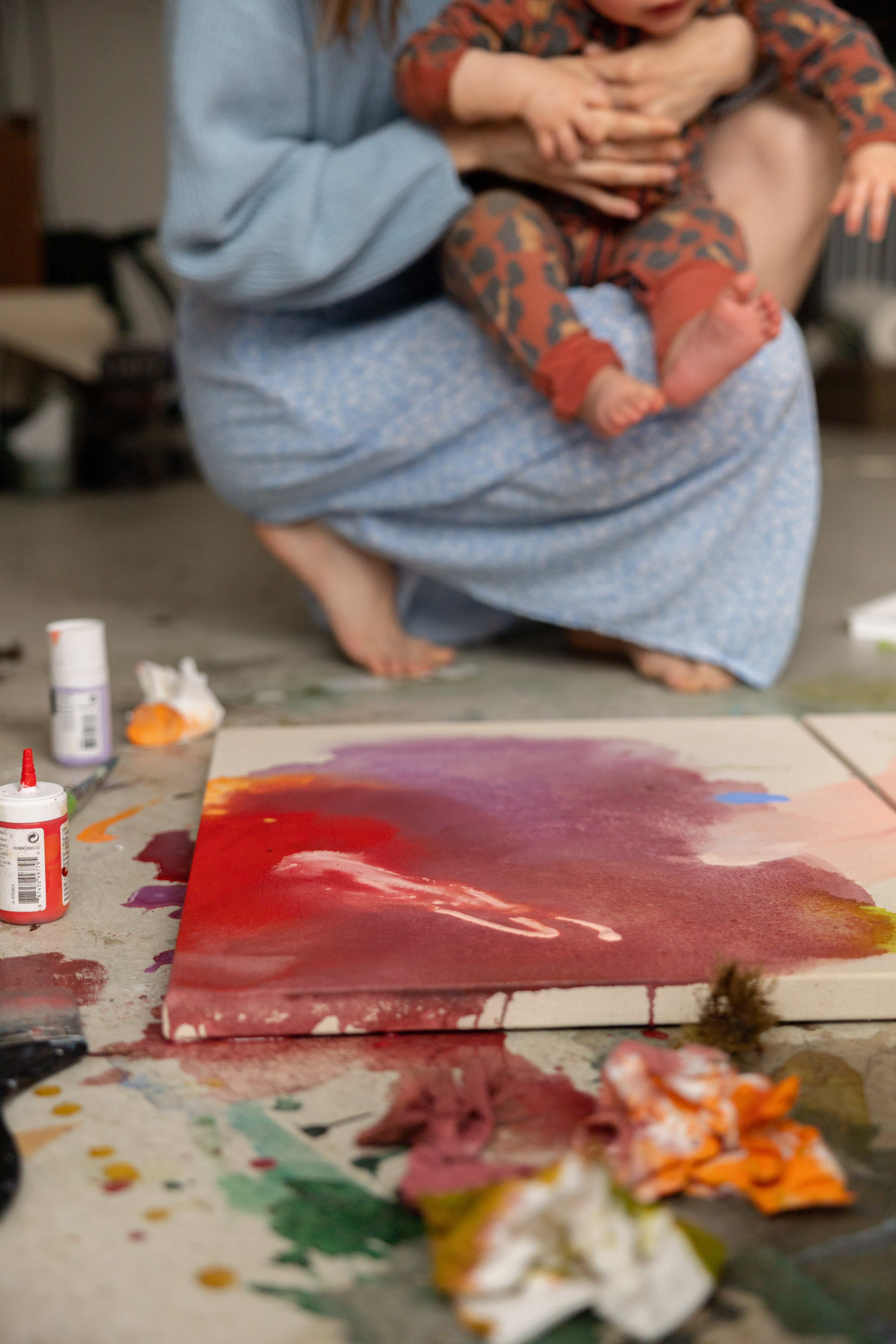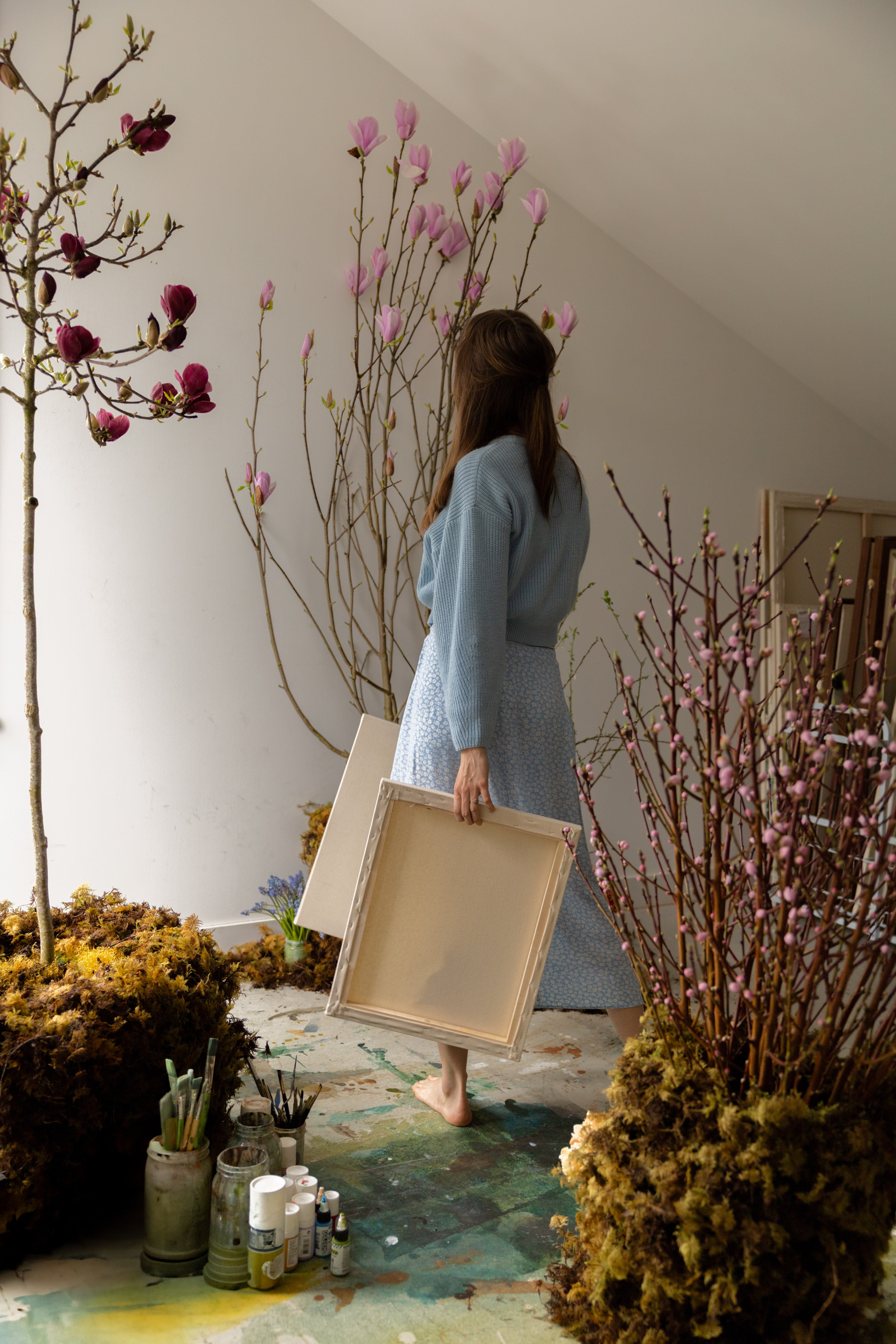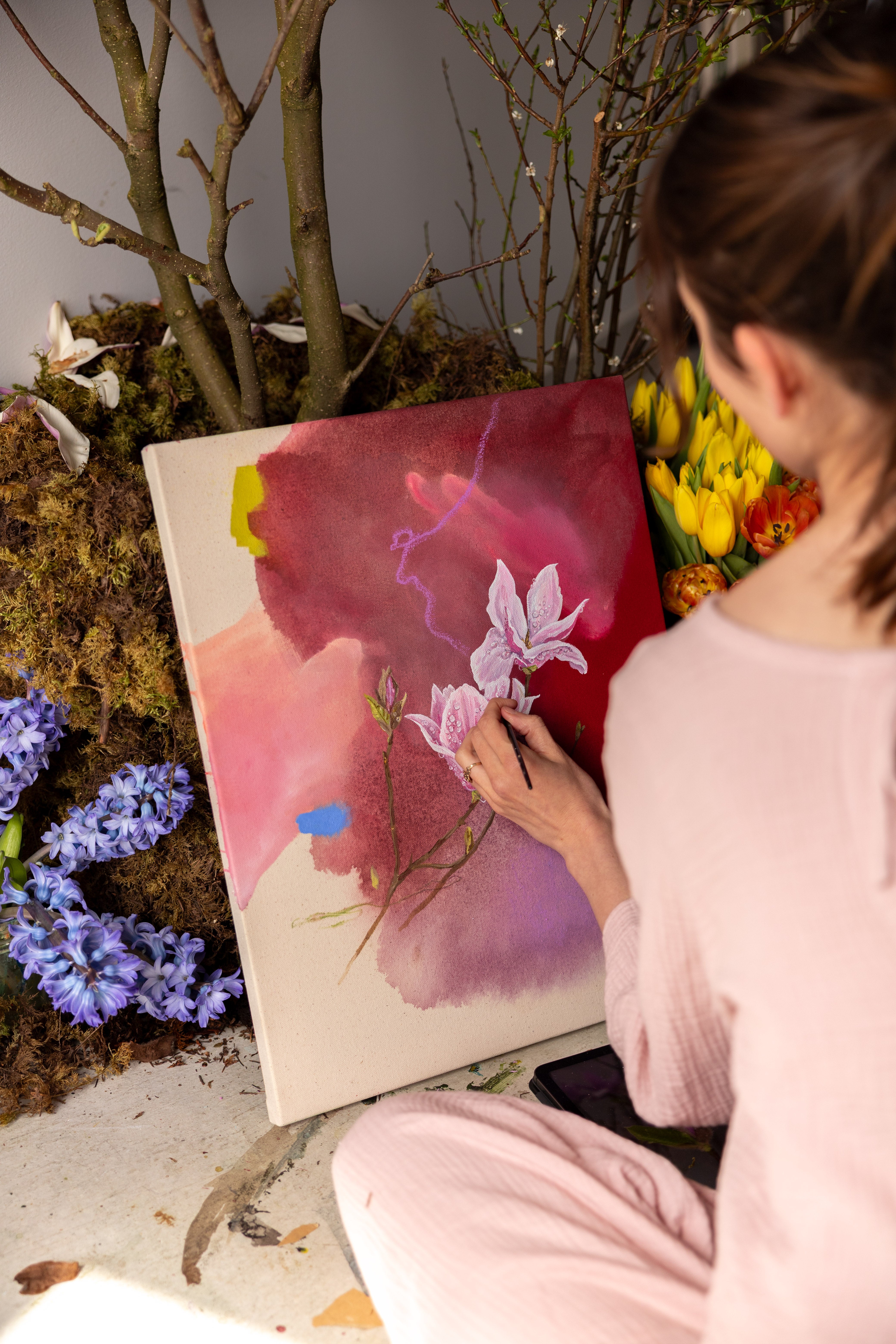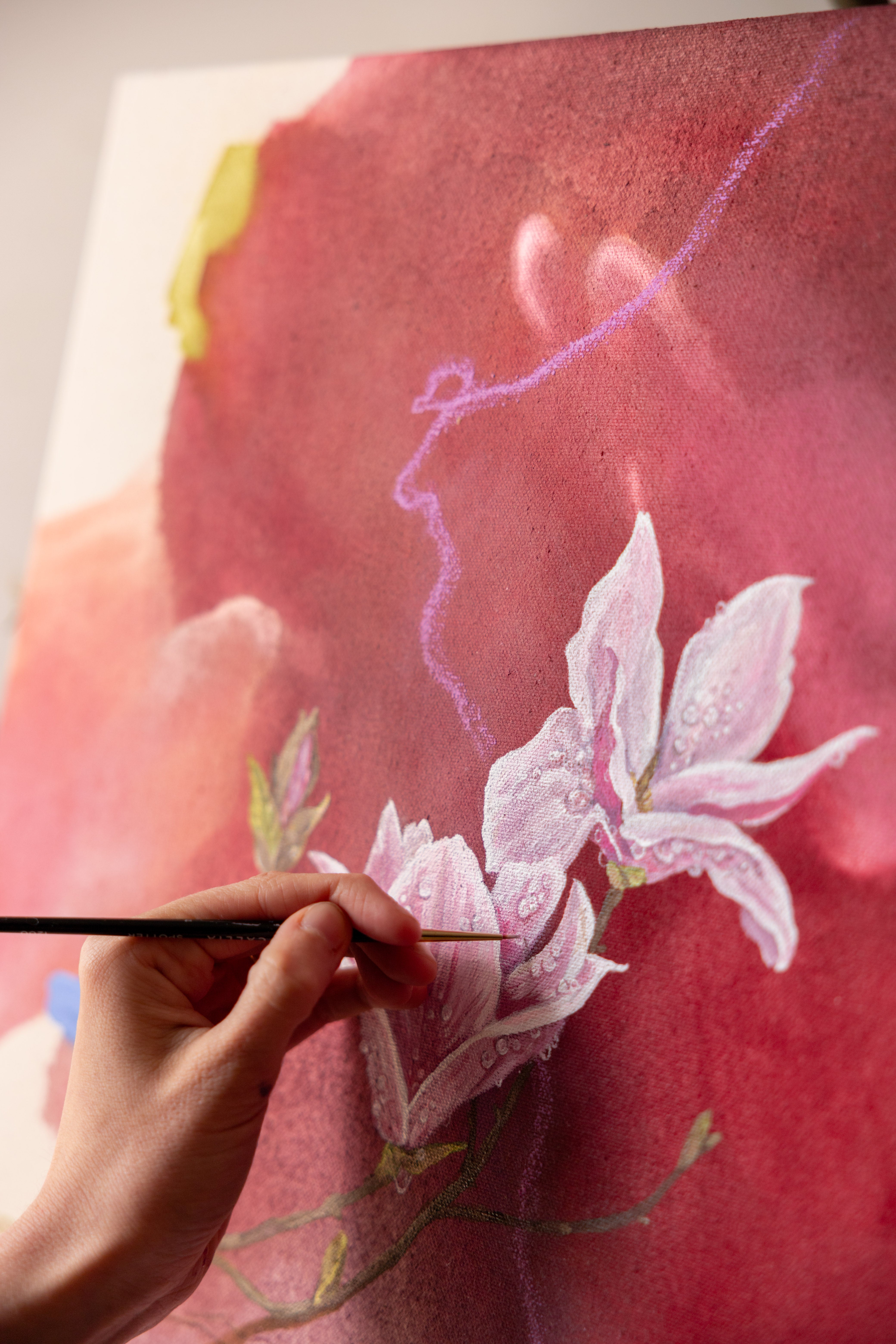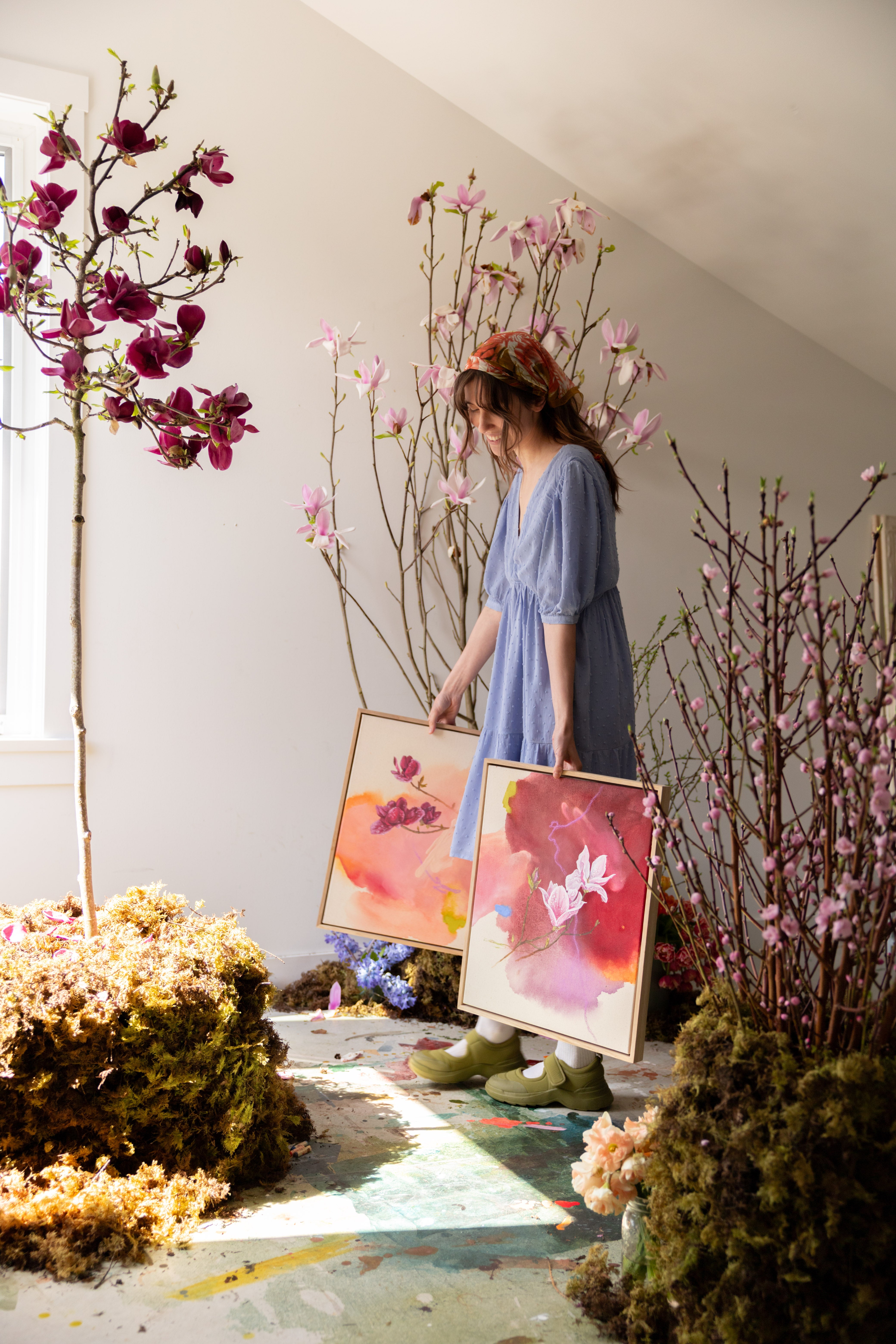 I had hoped to paint these pieces outside in the sun in a meadow surrounded by blooming trees. The rain had other plans though so we brought magnolia trees into my studio and painted in my own studio meadow. This process was a little reminder to me of how mothers rise to the occasion even when the plans change, to bloom even in the rain, which became the main inspiration for these pieces. When I look at these flowers with raindrops covering their petals, I feel seen, and I hope these pieces minister to mothers around the world to see themselves in these artworks too.