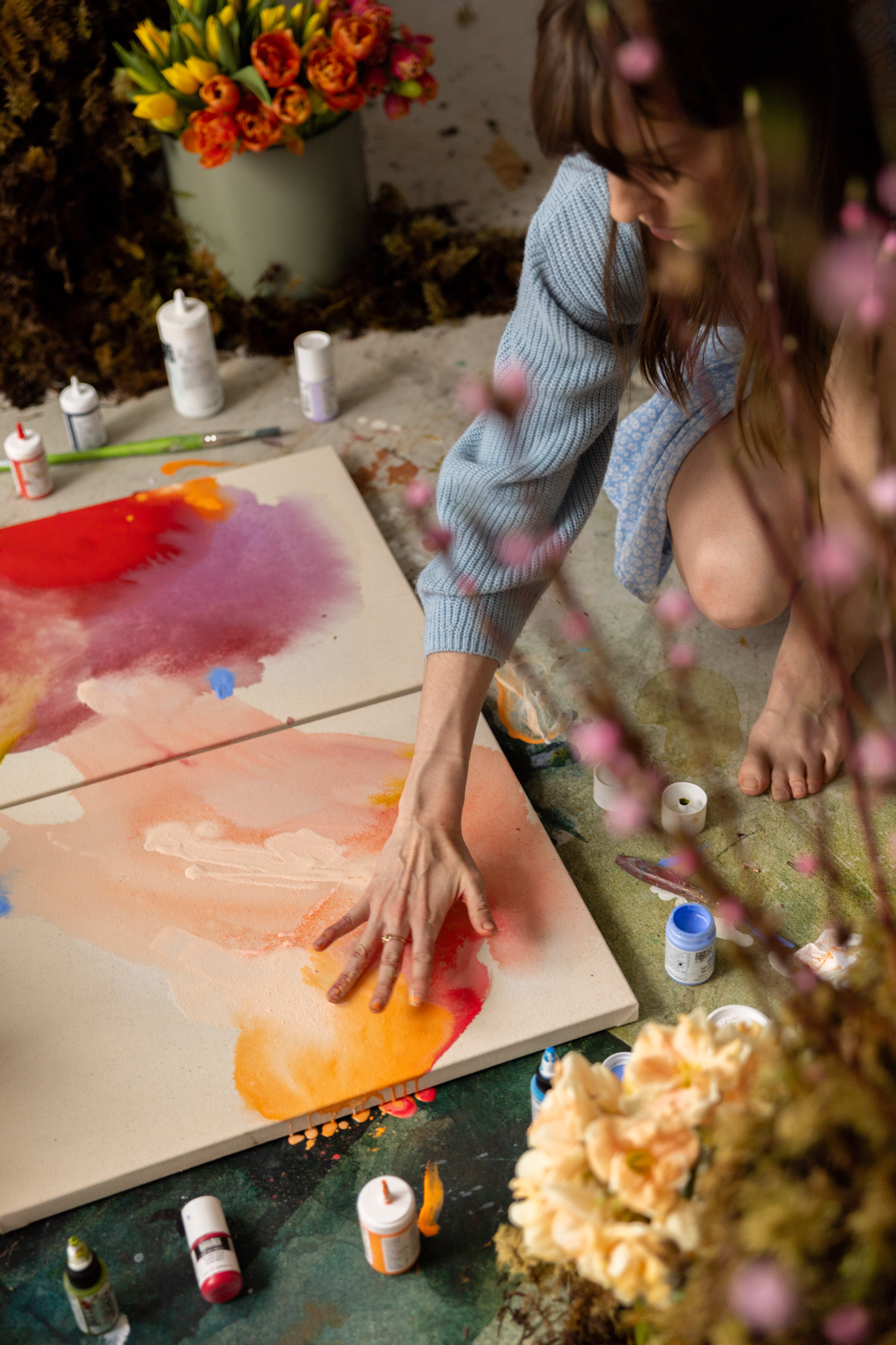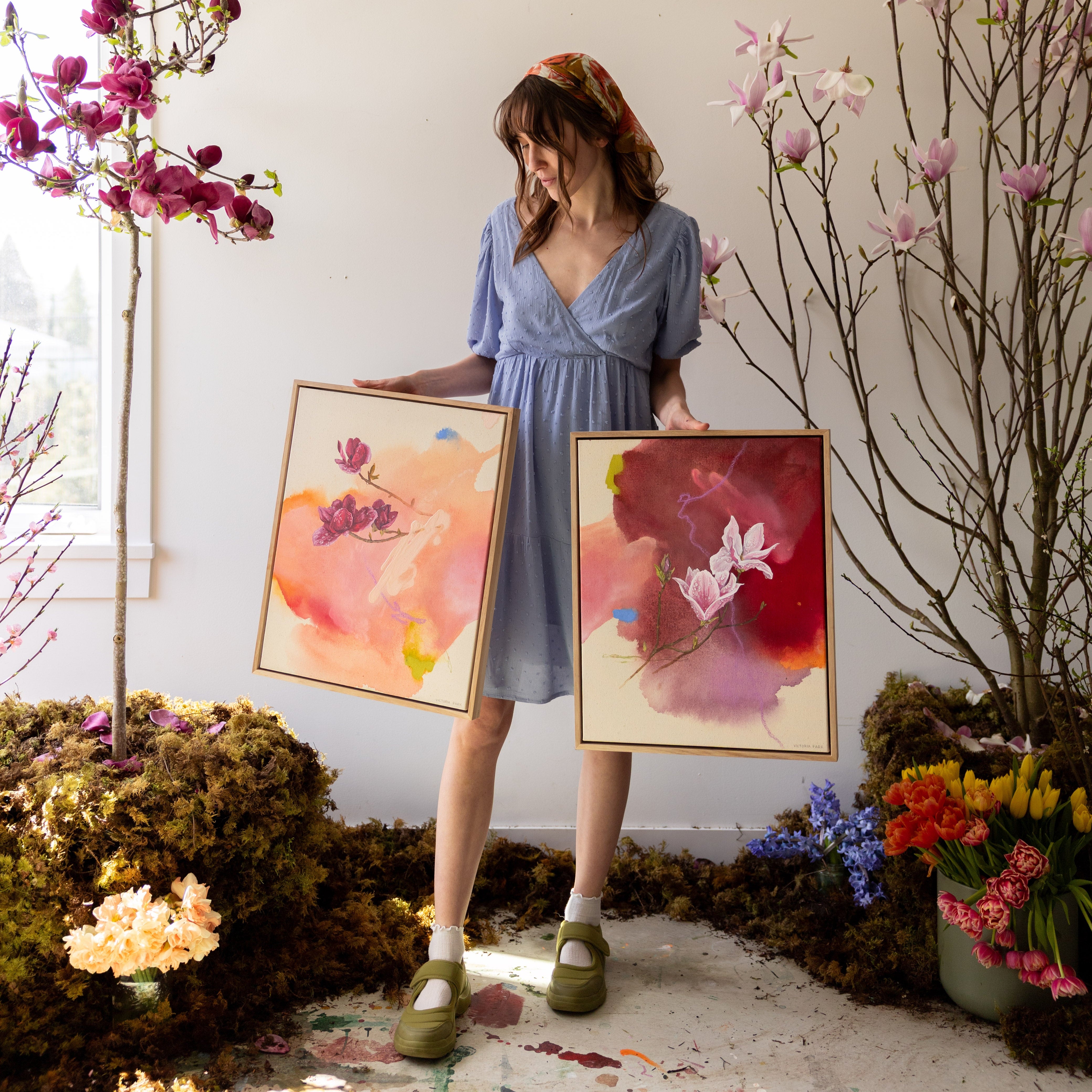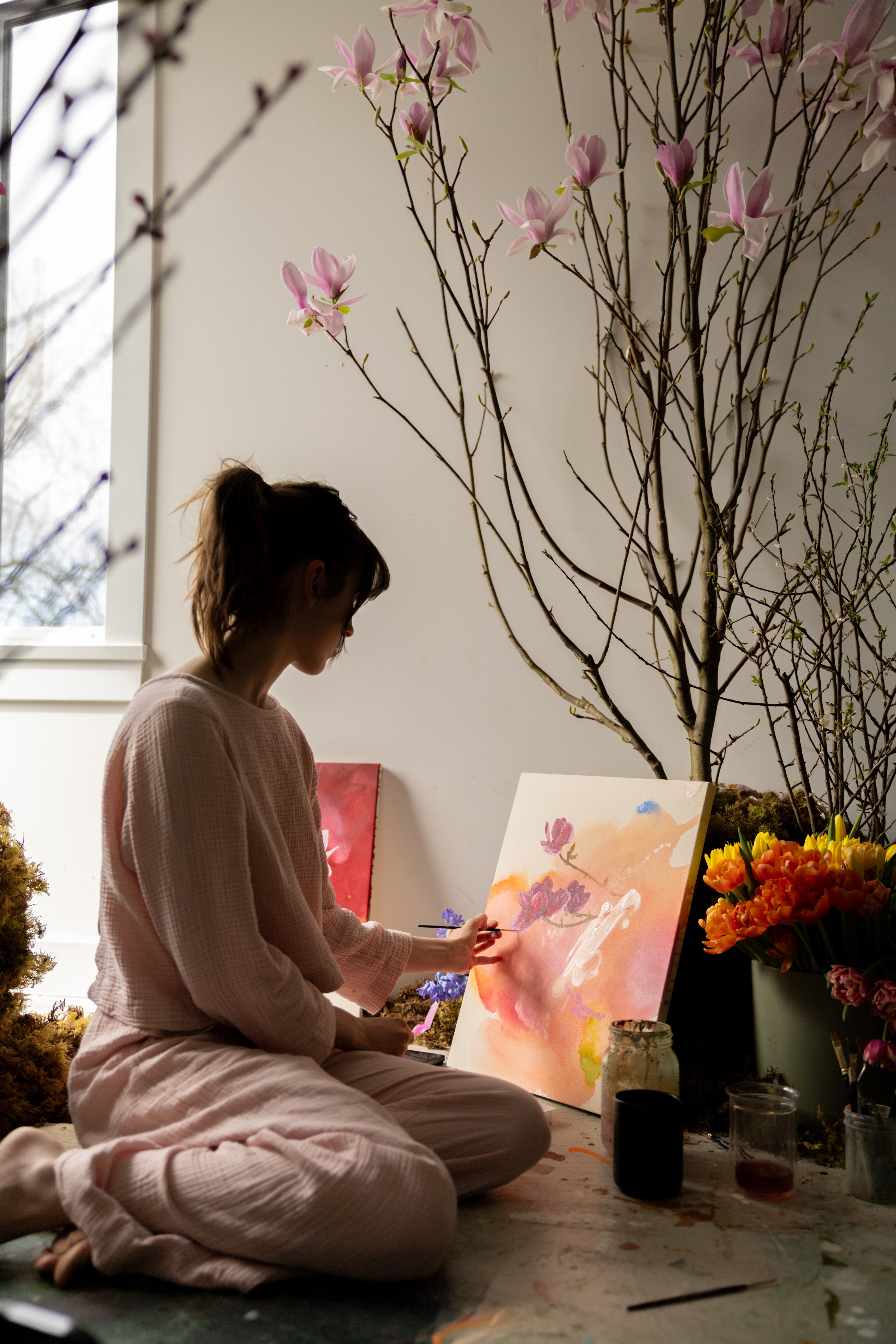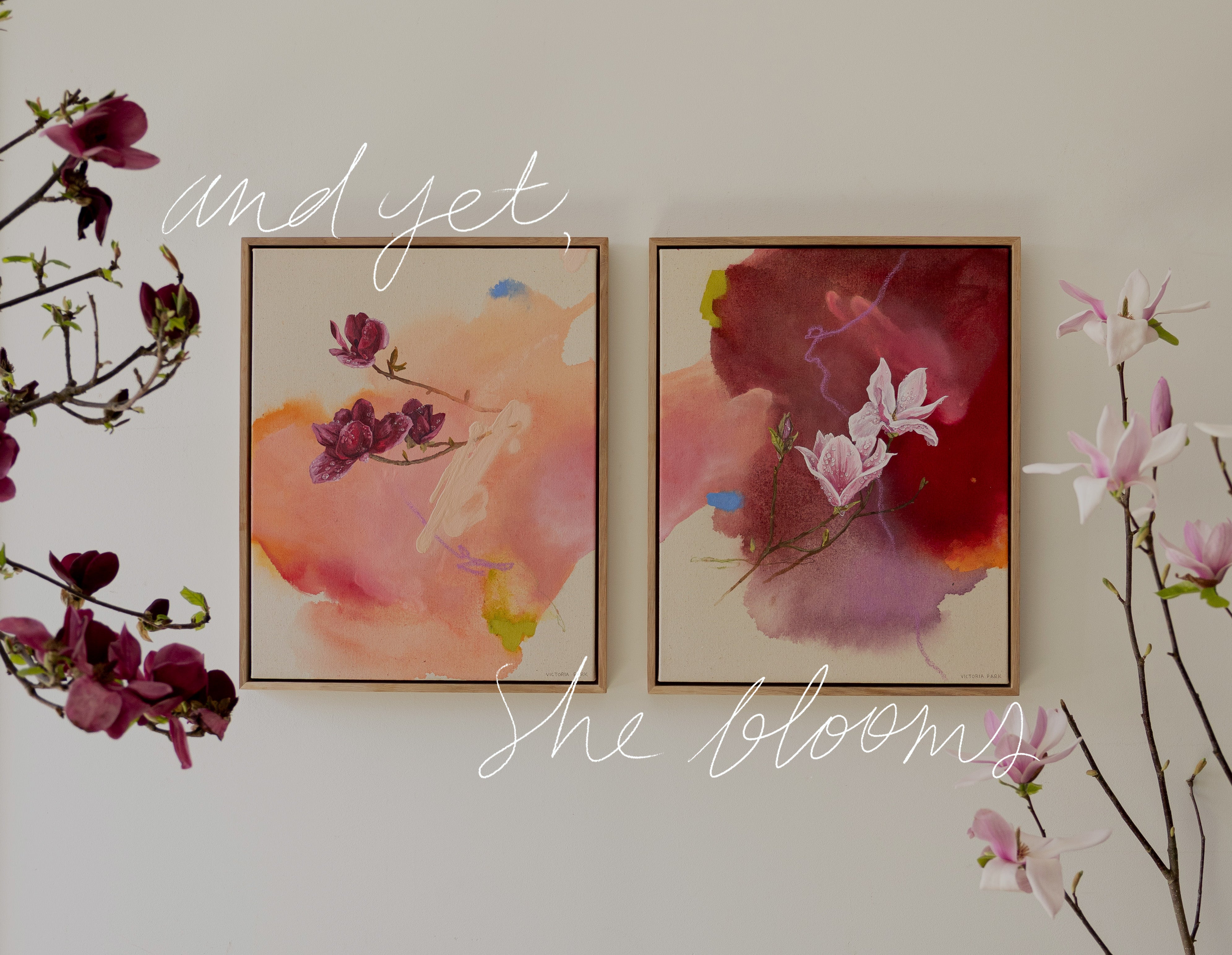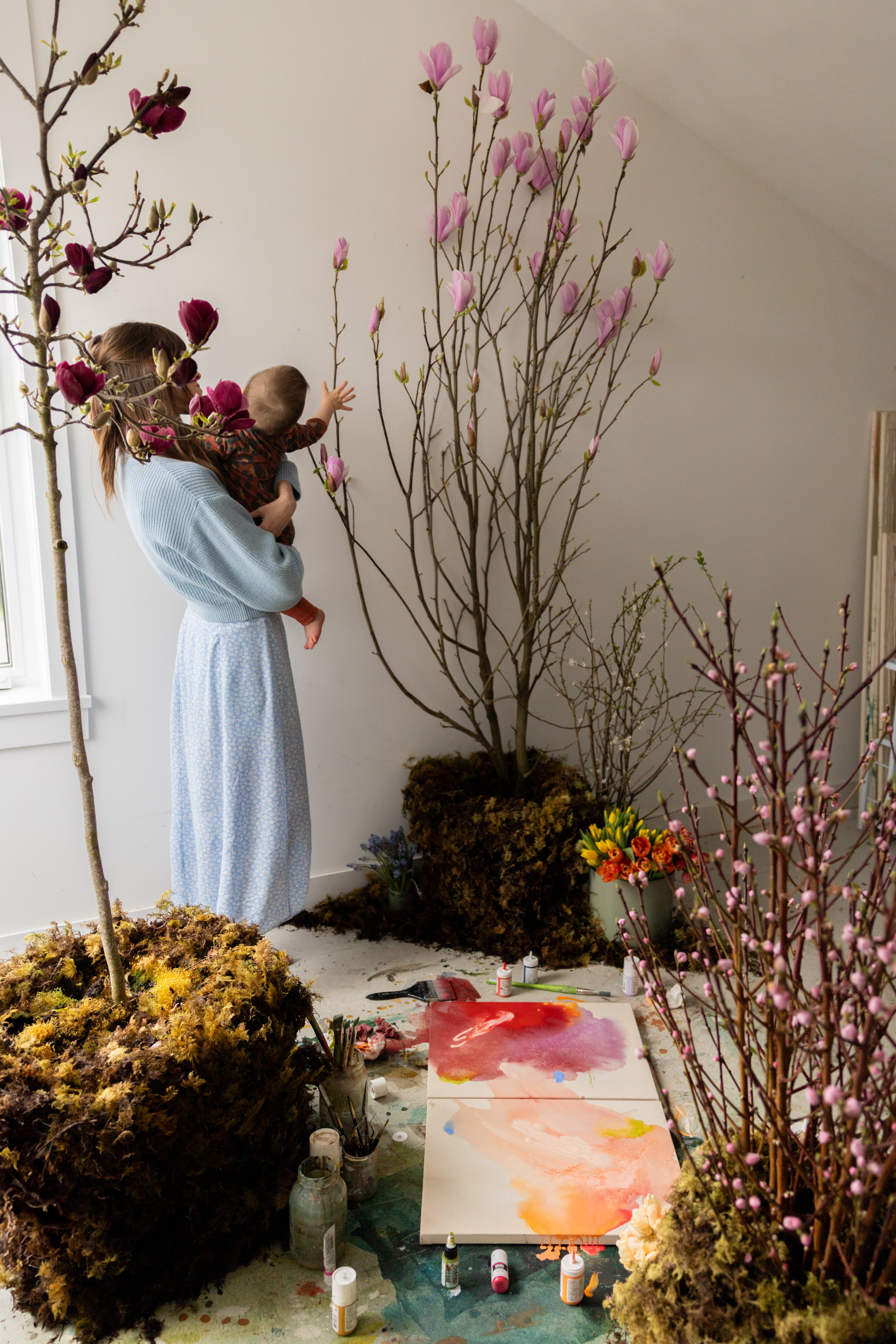 I had hoped to paint these pieces outside in the sun in a meadow surrounded by blooming trees. The rain had other plans though so we brought magnolia trees into my studio and painted in my own studio meadow. This process was a little reminder to me of how mothers rise to the occasion even when the plans change, to bloom even in the rain, which became the main inspiration for these pieces. When I look at these flowers with raindrops covering their petals, I feel seen, and I hope these pieces minister to mothers around the world to see themselves in these artworks too.