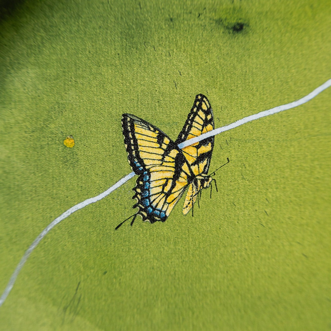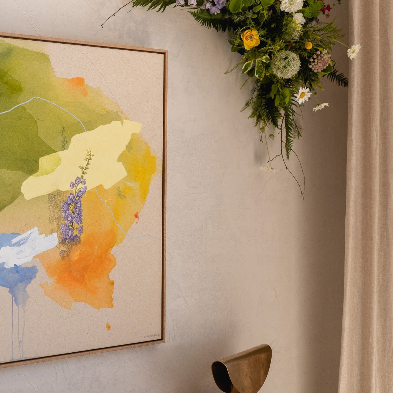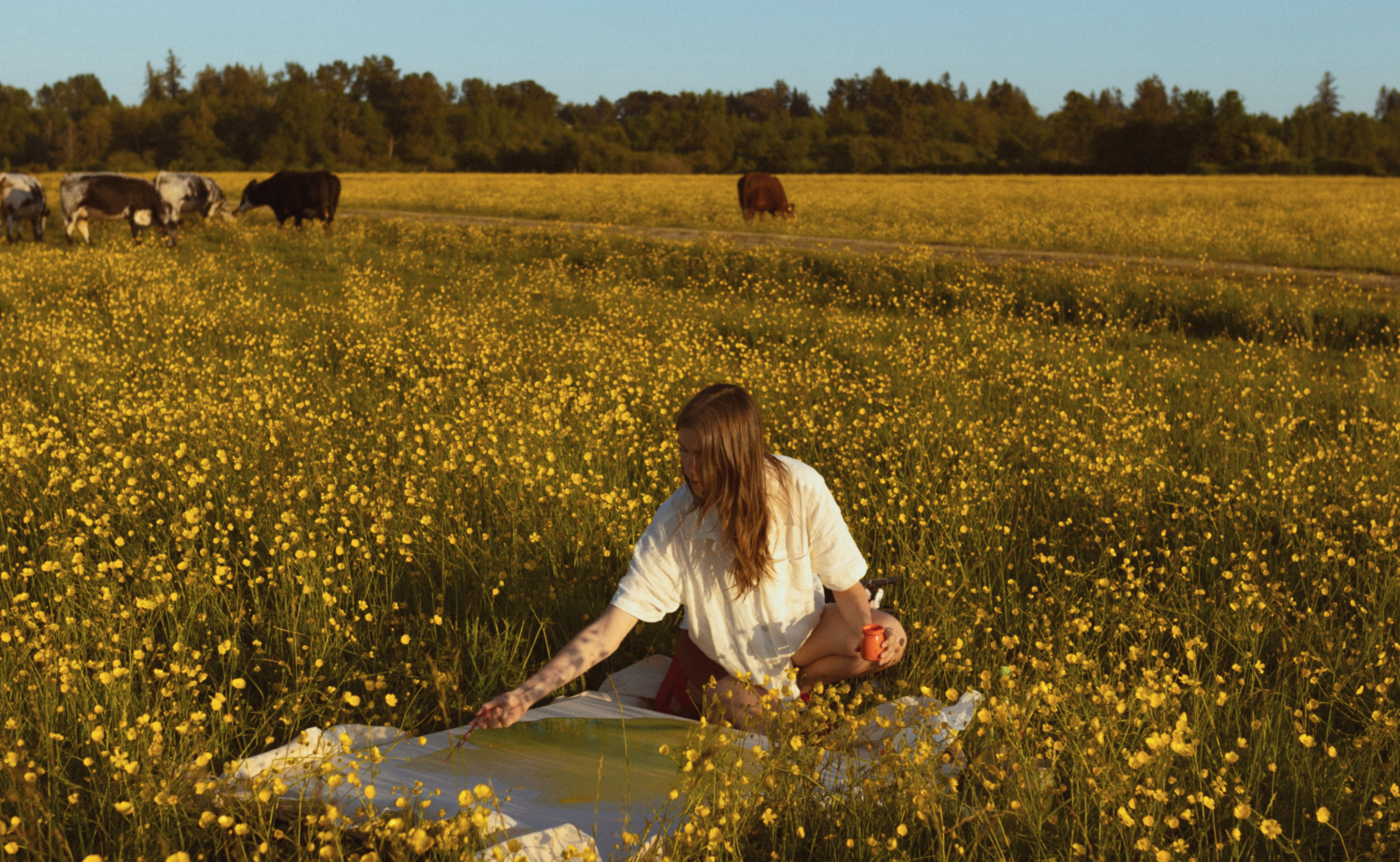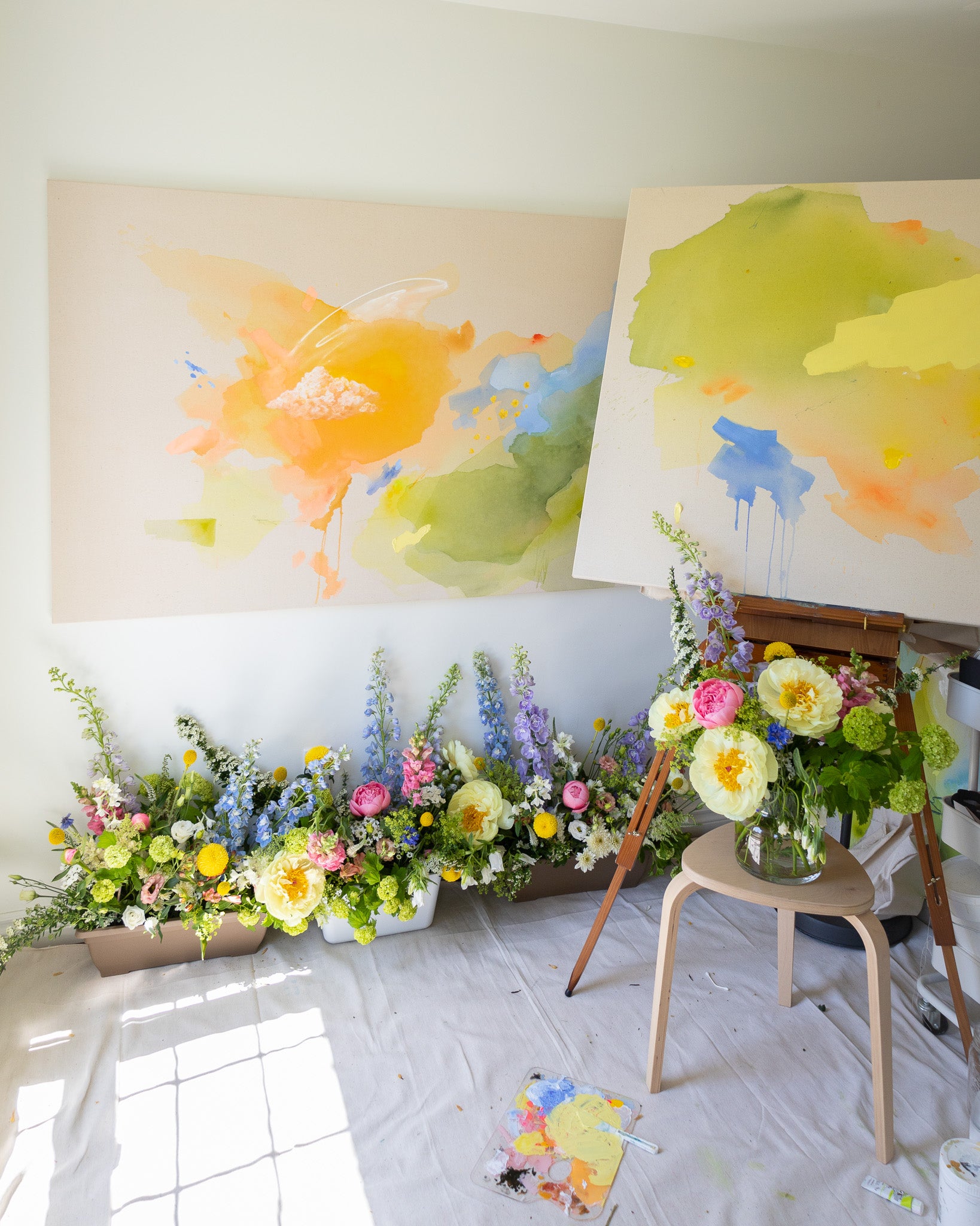 These paintings were born right outside my front door in the surrounding fields of my home. Buttercup petals, grass, and morning dew were all welcome to make their mark in my artworks as curious cows wandered by. I am extremely grateful to call this place home and I wanted these paintings to capture the peace, joy, and gratitude I feel during my frequent walks I take here to refocus and be present.