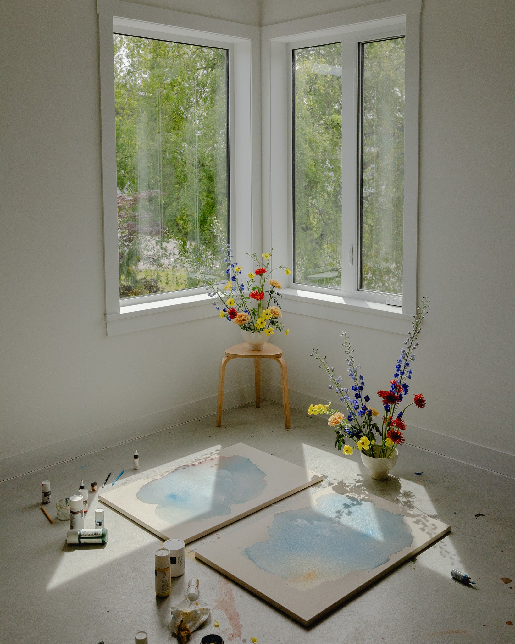 I've been in this studio space for almost a year now and it has become a second home to me and my family. It's a safe space to explore my wild ideas, make coffees for visiting friends, nap, have a good cry, or burst into spontaneous dance parties. The corner windows in the studio remind me daily that the sky is the limit with creativity if I just open my eyes to look beyond the frame.
