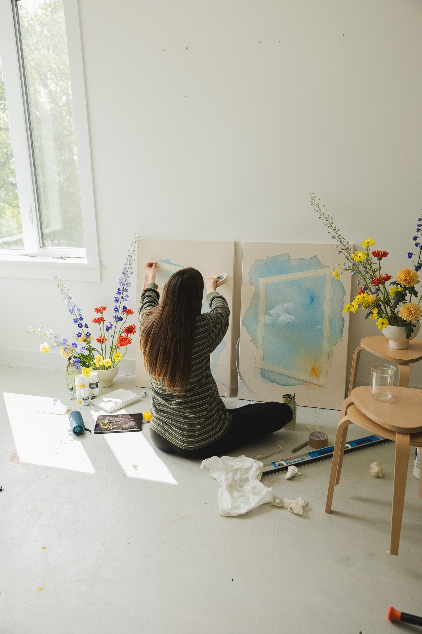 I've been in this studio space for almost a year now and it has become a second home to me and my family. It's a safe space to explore my wild ideas, make coffees for visiting friends, nap, have a good cry, or burst into spontaneous dance parties. The corner windows in the studio remind me daily that the sky is the limit with creativity if I just open my eyes to look beyond the frame.